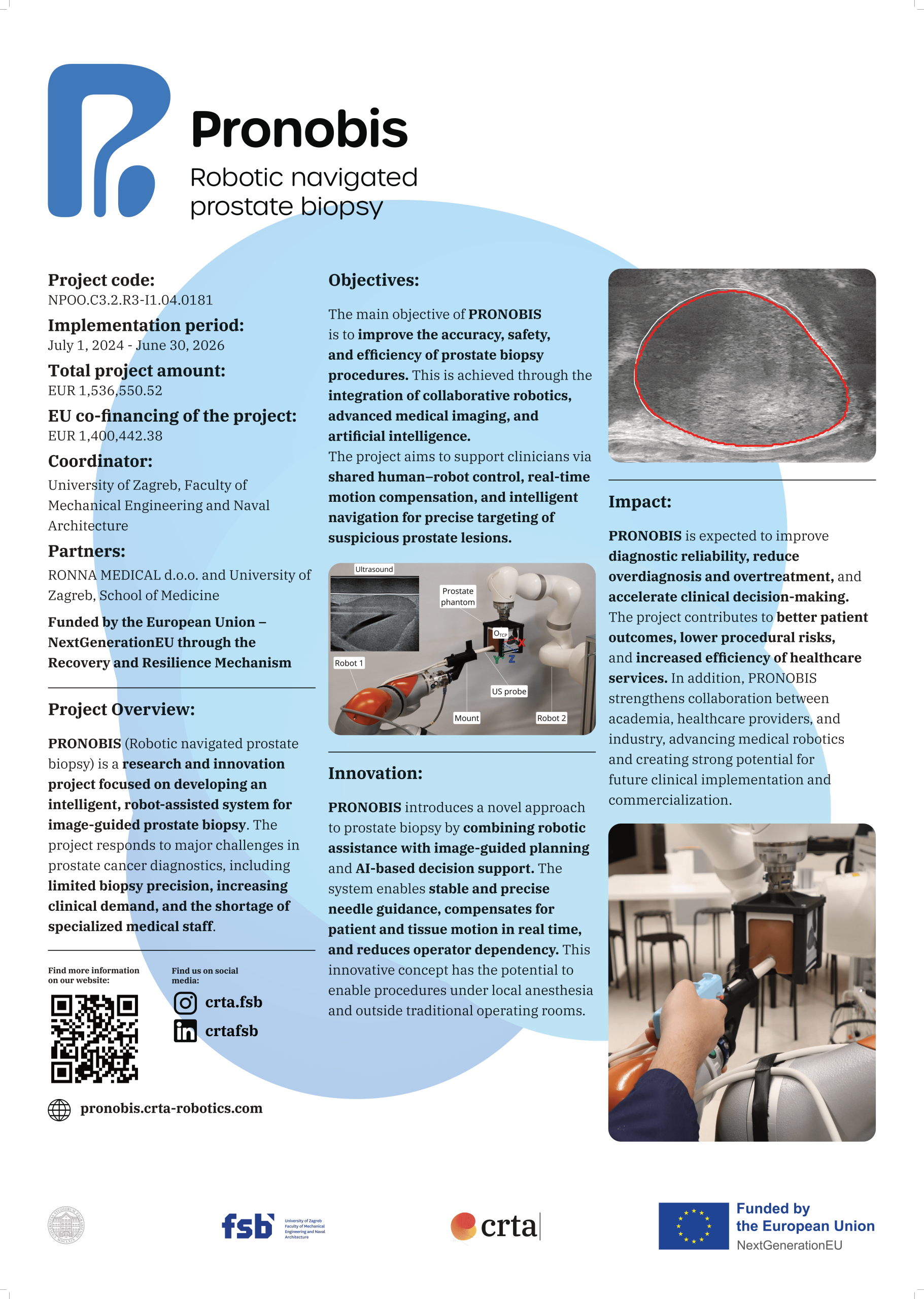 PRONOBIS ist ein multidisziplinäres Forschungs- und Entwicklungsprojekt, das ein robotergestütztes Prostatabiopsiesystem entwickelt, das mit fortschrittlichen Softwarelösungen und intelligenten Algorithmen integriert ist, um den gesamten Vorgang zu optimieren.