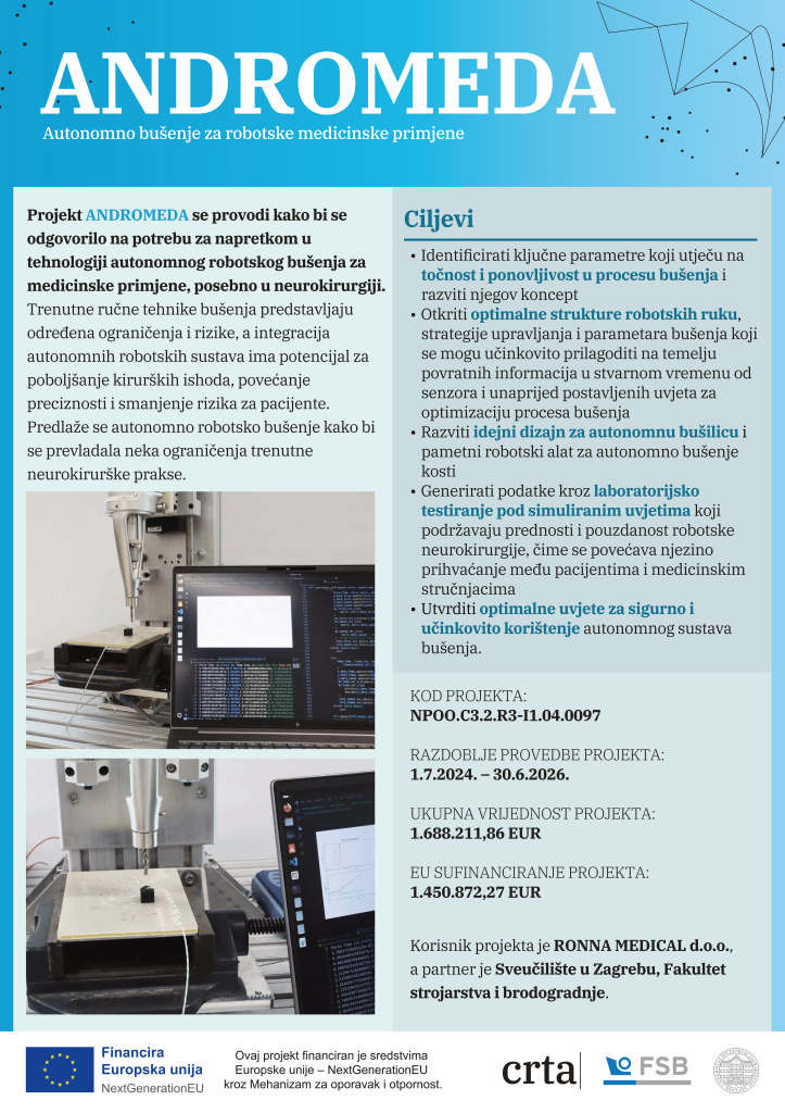 Projekt ANDROMEDA razvija novu tehnologiju autonomnog robotskog bušenja za potrebe neurokirurgije s ciljem povećanja preciznosti, sigurnosti i učinkovitosti kirurških zahvata. Današnje ručne tehnike bušenja kostiju, posebice kod kraniotomije, nose niz izazova i rizika, čak i za najvještije kirurge. Ograničenja ljudske preciznosti, fizički umor i varijabilnost postupaka dodatni su razlozi za razvoj autonomnih rješenja.